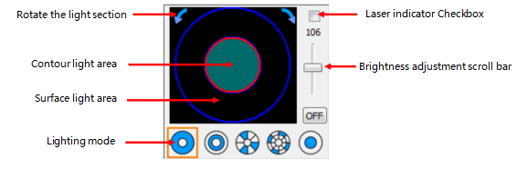 The following contents describes the brightness adjustment methods of the contour light, coaxial light, and surface light. The surface light supports the “5-ring 8-section” lighting mode.