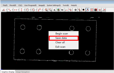 Step 4: Click the OK button, the software will control the machine to perform the jigsaw scanning for the workpiece, after the scanning is complete, you will get the point clouds contour of the workpiece in the graphics area. Click the right mouse button in the graphics area and select the“Save data”menu option to save the contour as a dxf format document.